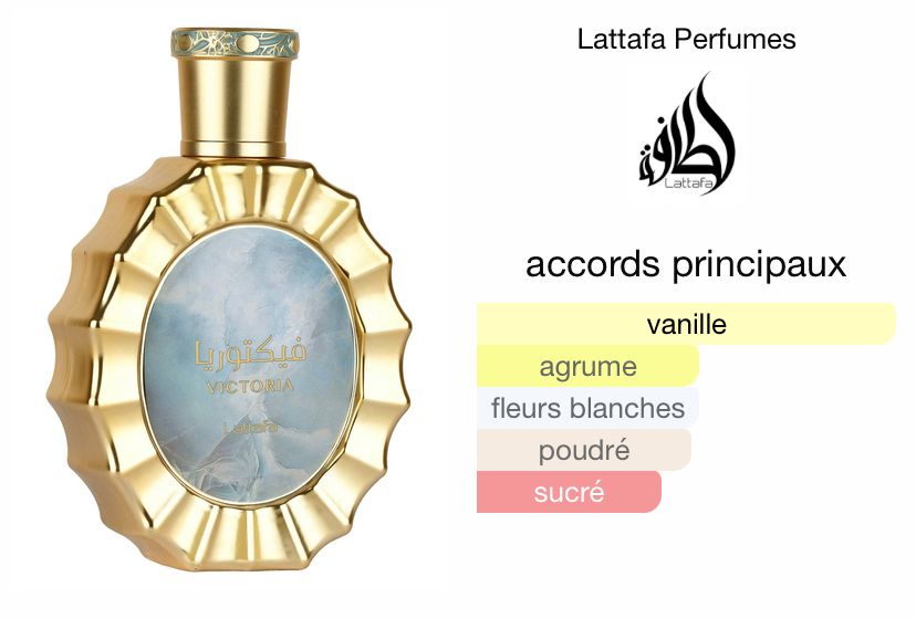 Victoria de Lattafa Perfumes est un parfum Floral Fruité Gourmand pour homme et femme. C'est un nouveau parfum. Victoria a été lancé en 2025. La note de tête est Lemon Meringue Pie; la note de coeur est Néroli; la note de fond est Vanille.